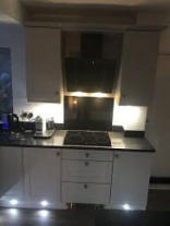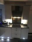 measure tall unit, touch control ceramic hob modern angled extractor hood, Black Quartz worktops and a